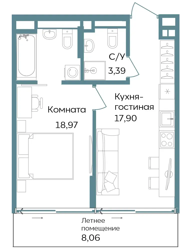 Студии и апартаменты с 1–3 комнатами в формате европланировок.