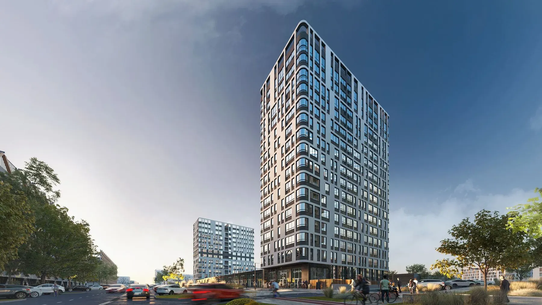 2 дома — 16 и 12 этажей, стилобат. Детский сад в 20 метрах, школа в 300 метрах. Прямой выезд на Объездную без пробок. Многоуровневый паркинг рядом.