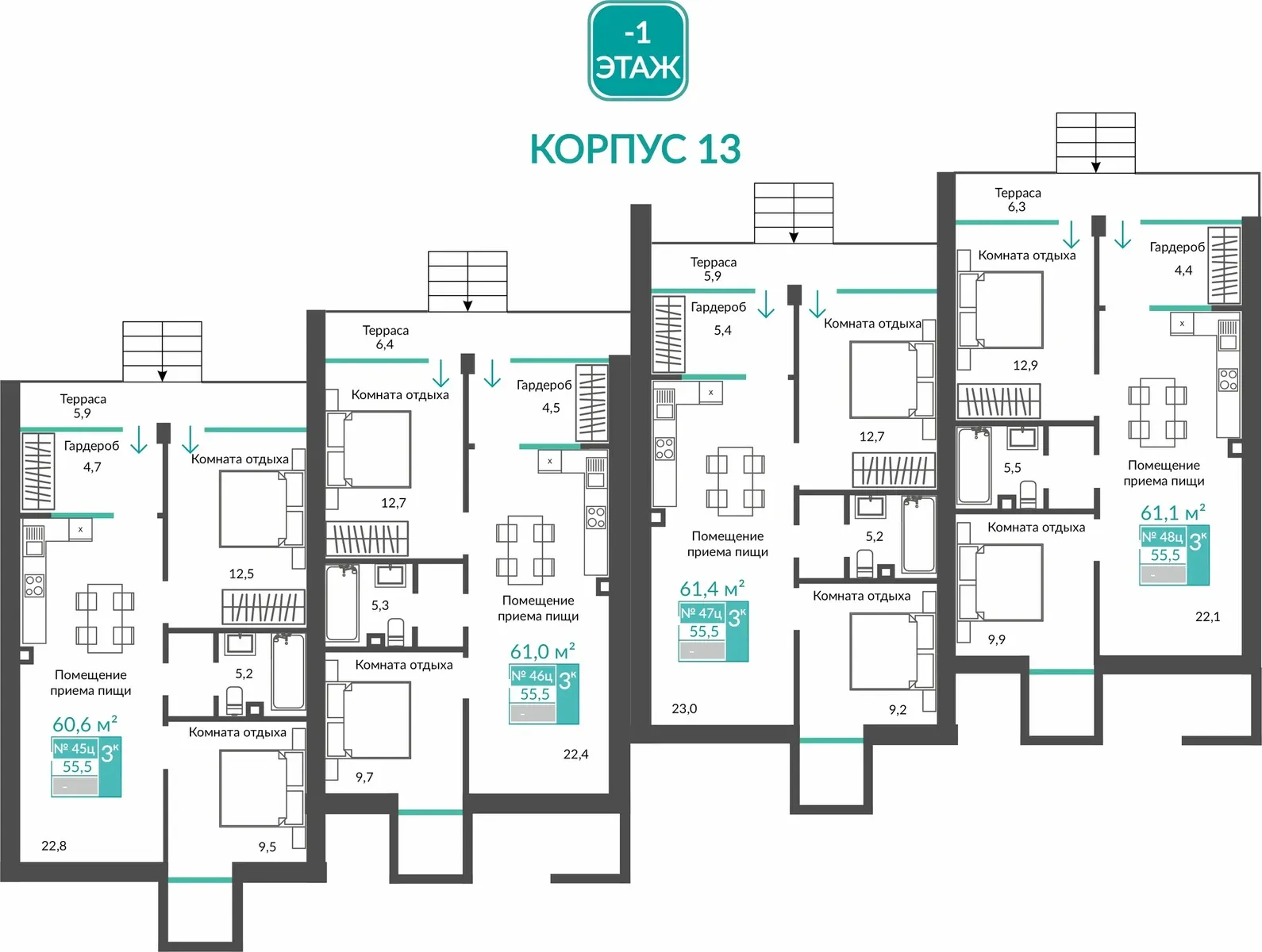 14 таунхаусов 2–3 этажа с панорамными окнами и видами на горы.