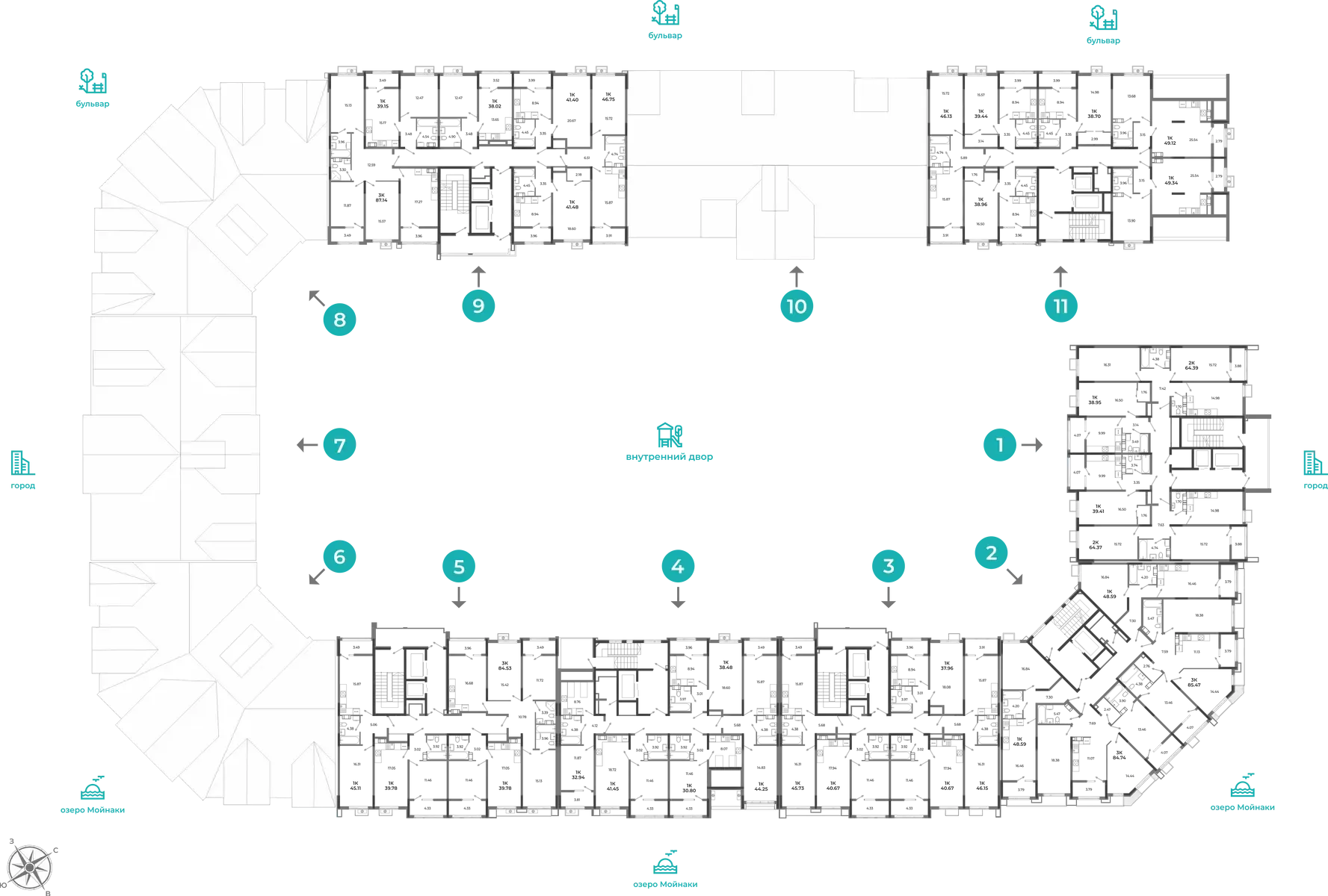 - Квартиры от функциональных студий (от 25 м²) до просторных трёхкомнатных (до 102 м²). Здесь можно купить квартиру как для одного, так и для большой семьи.