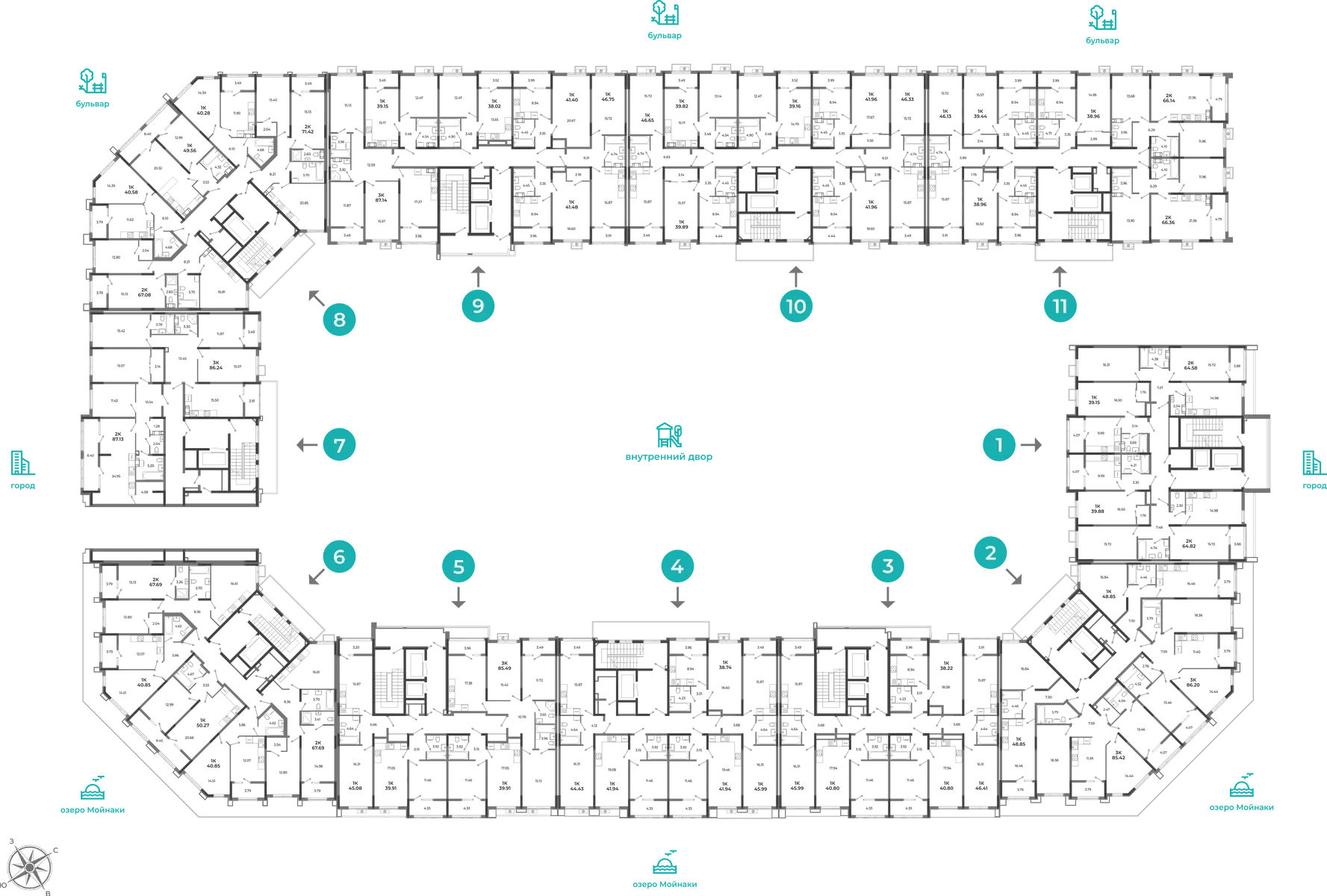 - Квартиры от функциональных студий (от 25 м²) до просторных трёхкомнатных (до 102 м²). Здесь можно купить квартиру как для одного, так и для большой семьи.
