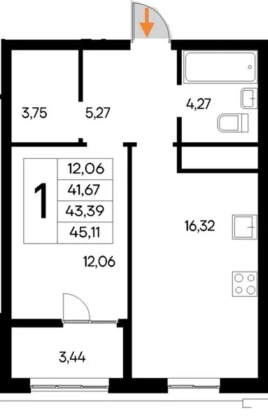 Квартира 1-комн. 45.11 кв. м