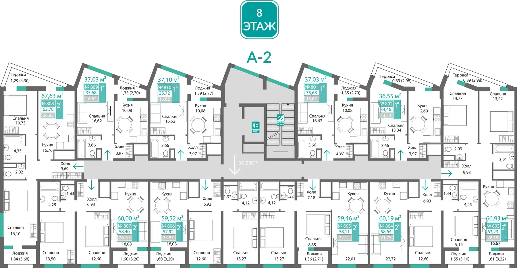 - Квартиры с собственными двориками на первых этажах — ваше личное патио, ориентированное во внутренний двор. Уникальное предложение для тех, кто мечтает о своем уголке зелени, не уезжая из города.