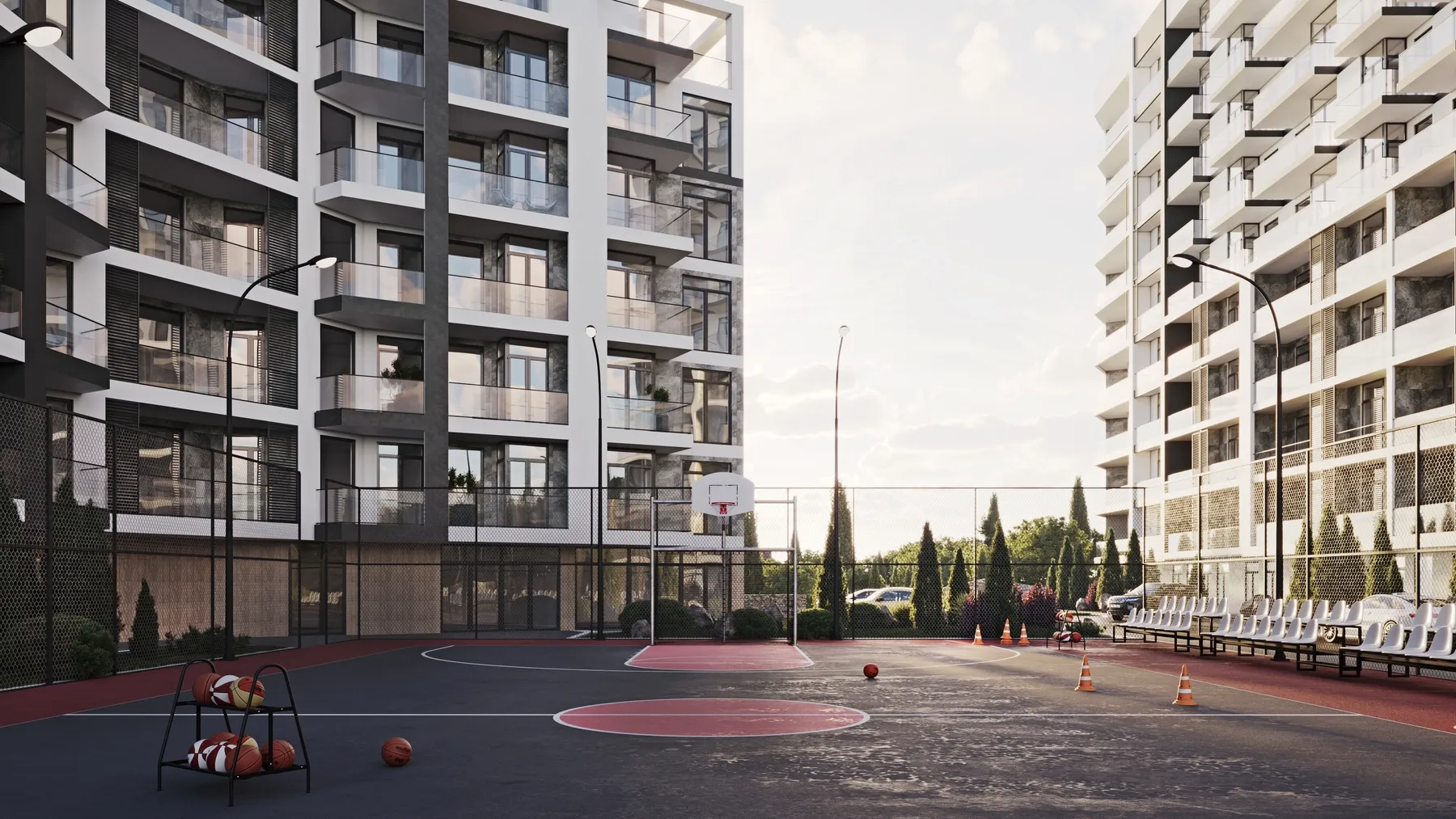 - Подземный и наземный паркинг — с зарядками для электромобилей.