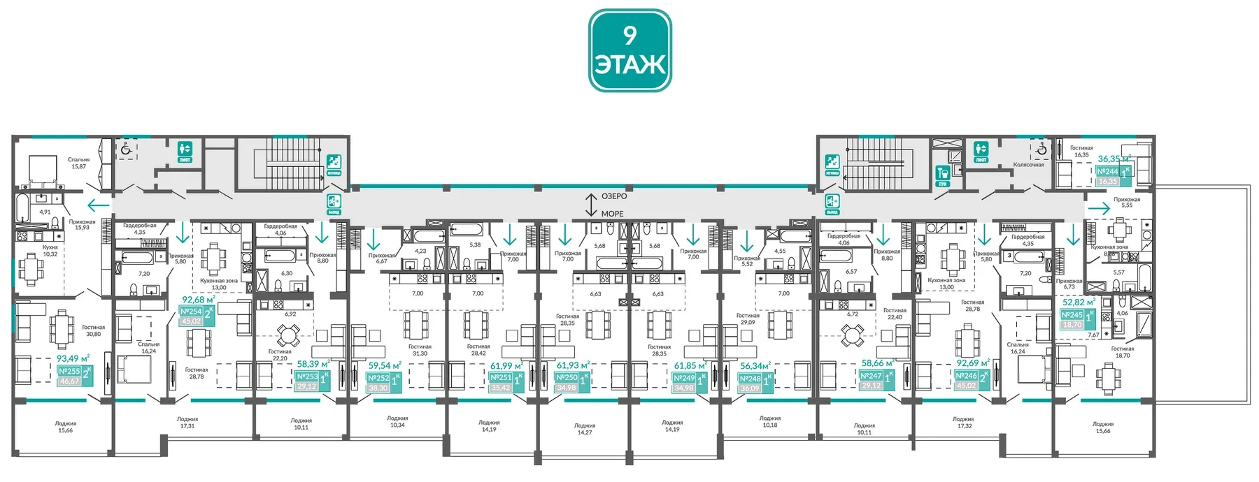 - Панорамное остекление и просторные балконы — солнечный свет и вид на бескрайнюю синеву.