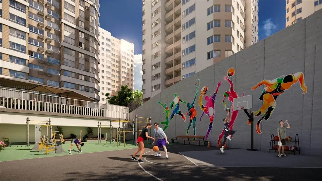 - Приватный двор без машин — это ваше личное пространство для отдыха. Здесь есть все: от современной детской площадки и воркаут-зоны до уютных лаунжей и оборудованной зоны барбекю.