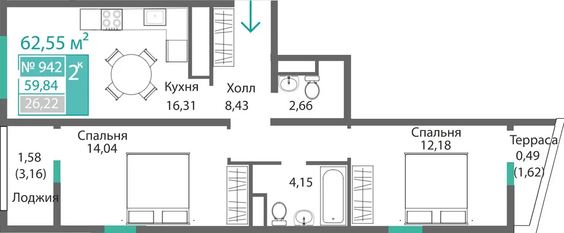 Квартира 2-комн. 59.84 кв.м