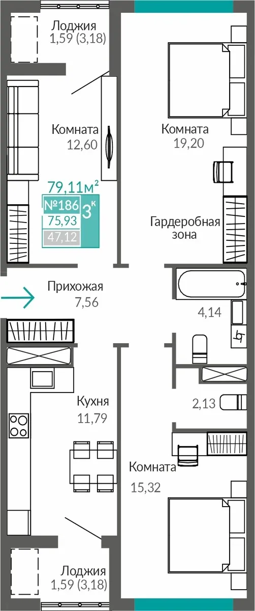 Квартира 3-комн. 75.93 кв.м