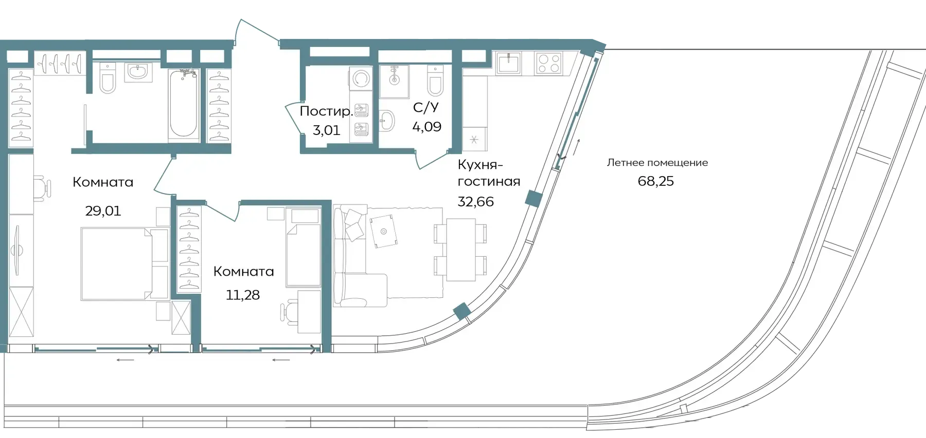 Студии и апартаменты с 1–3 комнатами в формате европланировок.