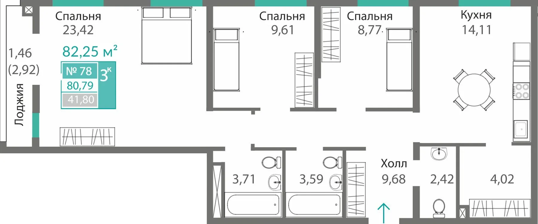 - 3-комнатные — до 78,5 м², пространство для семьи.