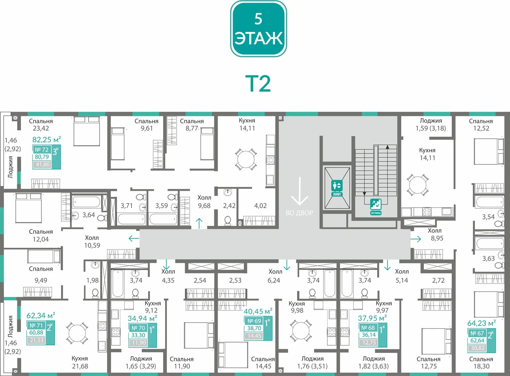 - 2-комнатные — 48–69 м², функциональность и комфорт.