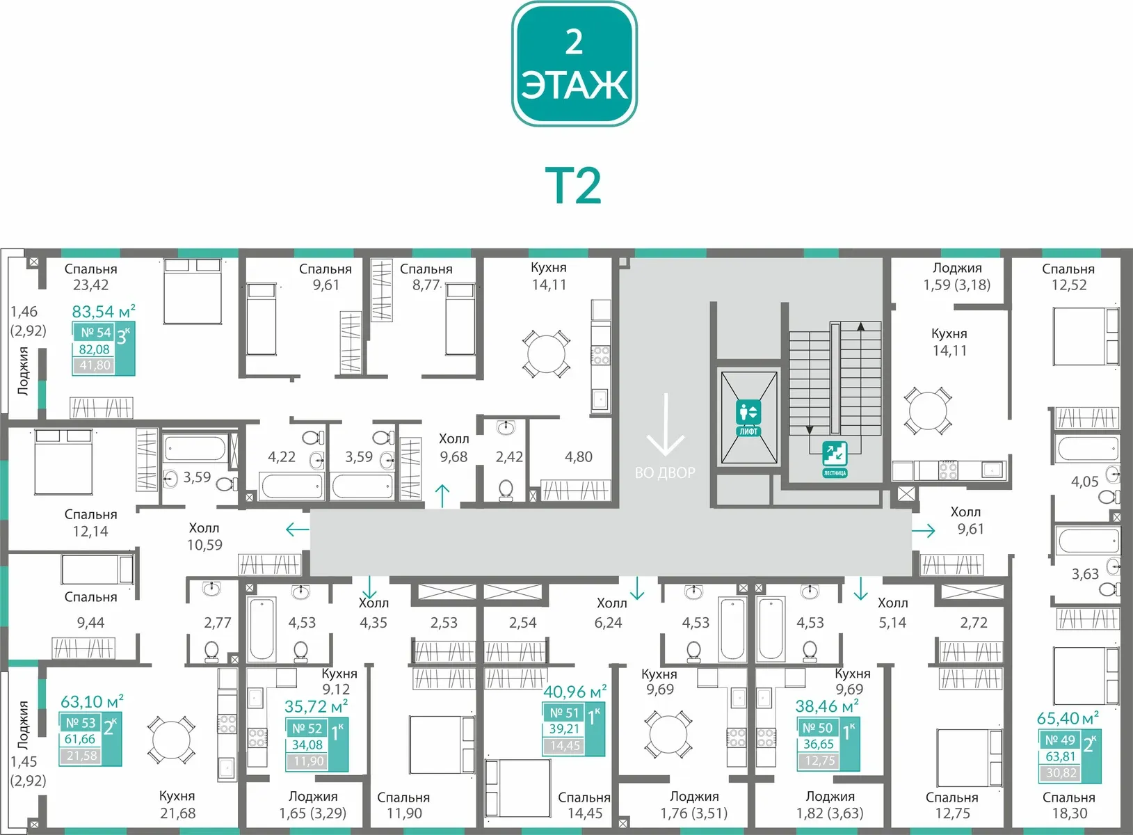 - 2-комнатные — 48–69 м², функциональность и комфорт.