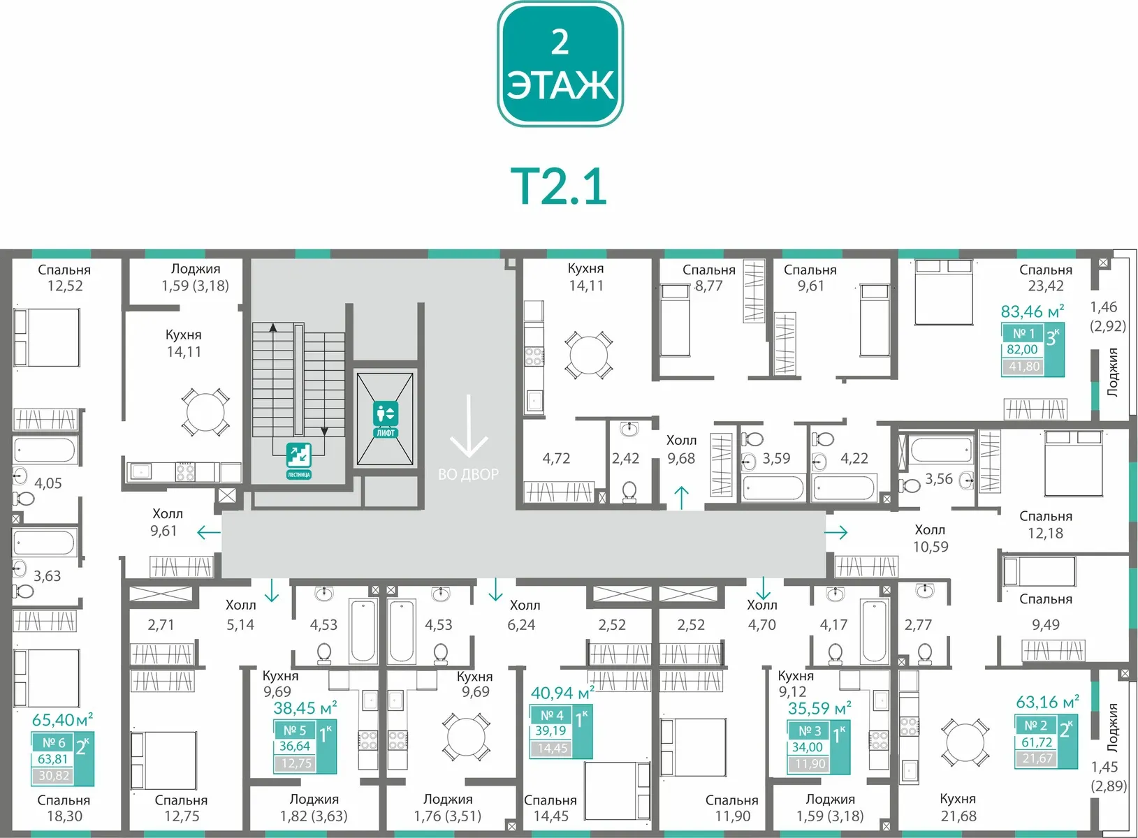 - 2-комнатные — 48–69 м², функциональность и комфорт.