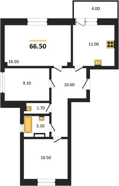 - Трёхкомнатные — 66 м²