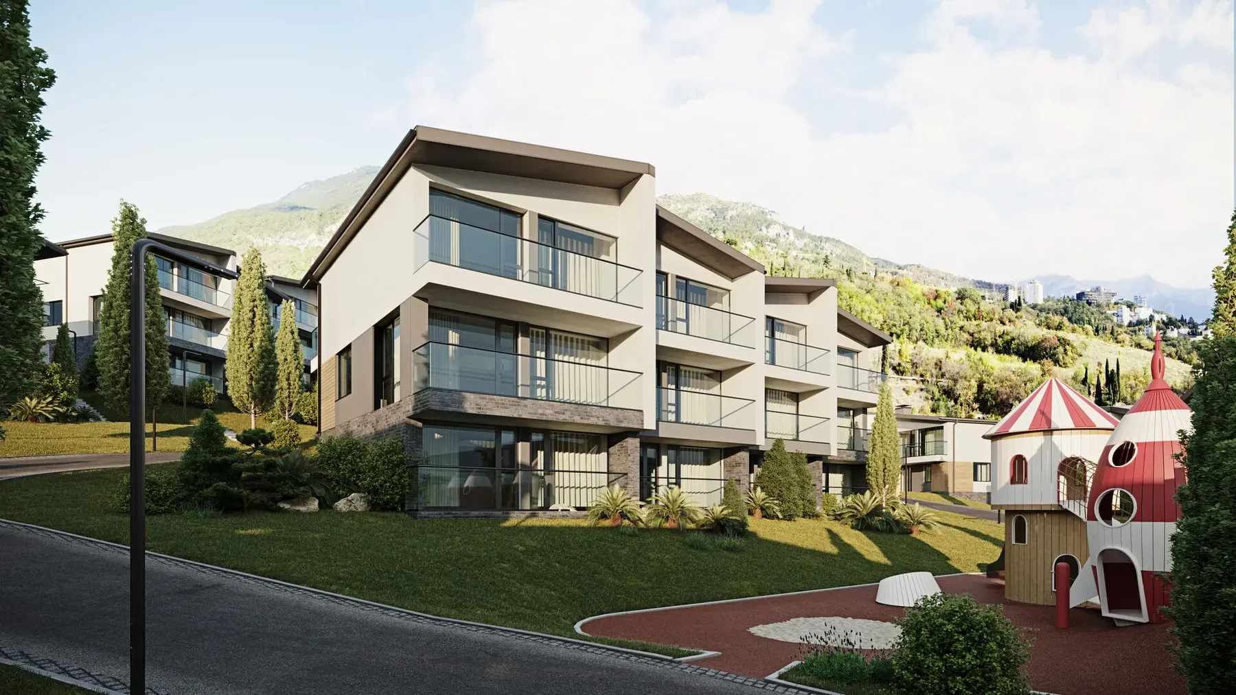 14 таунхаусов 2–3 этажа с панорамными окнами и видами на горы.