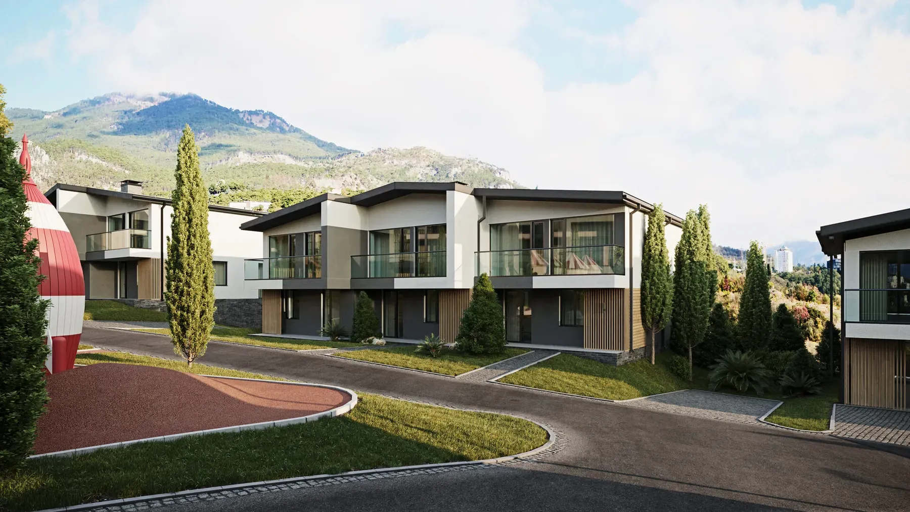 Благодаря продуманному расположению корпусов из каждого таунхауса открывается вид на море, горы или лес.