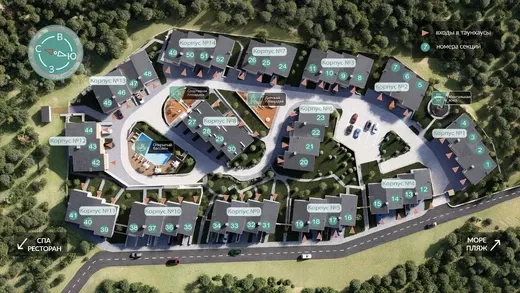 Благодаря продуманному расположению корпусов из каждого таунхауса открывается вид на море, горы или лес.