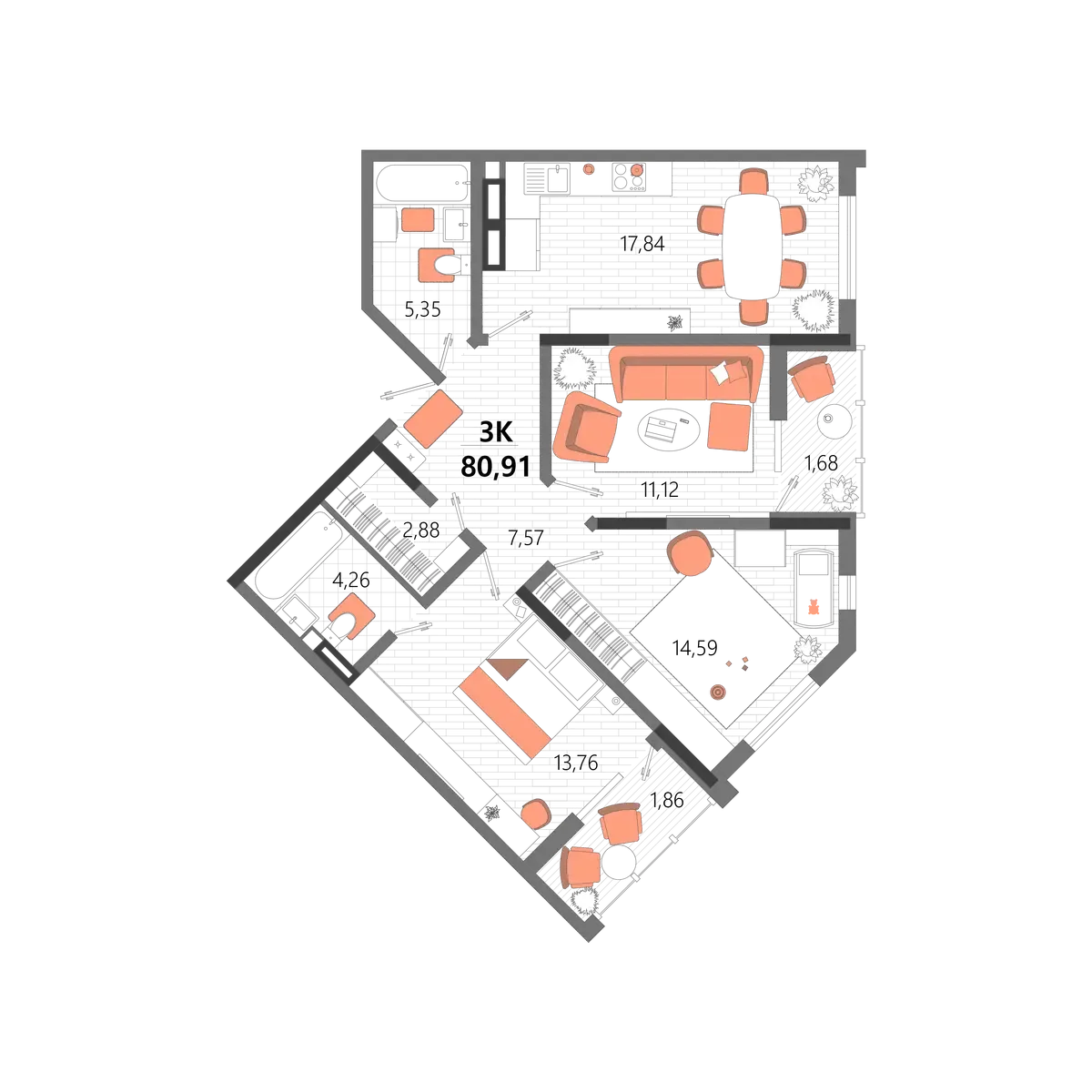 - Квартиры от функциональных студий (от 25 м²) до просторных трёхкомнатных (до 102 м²). Здесь можно купить квартиру как для одного, так и для большой семьи.