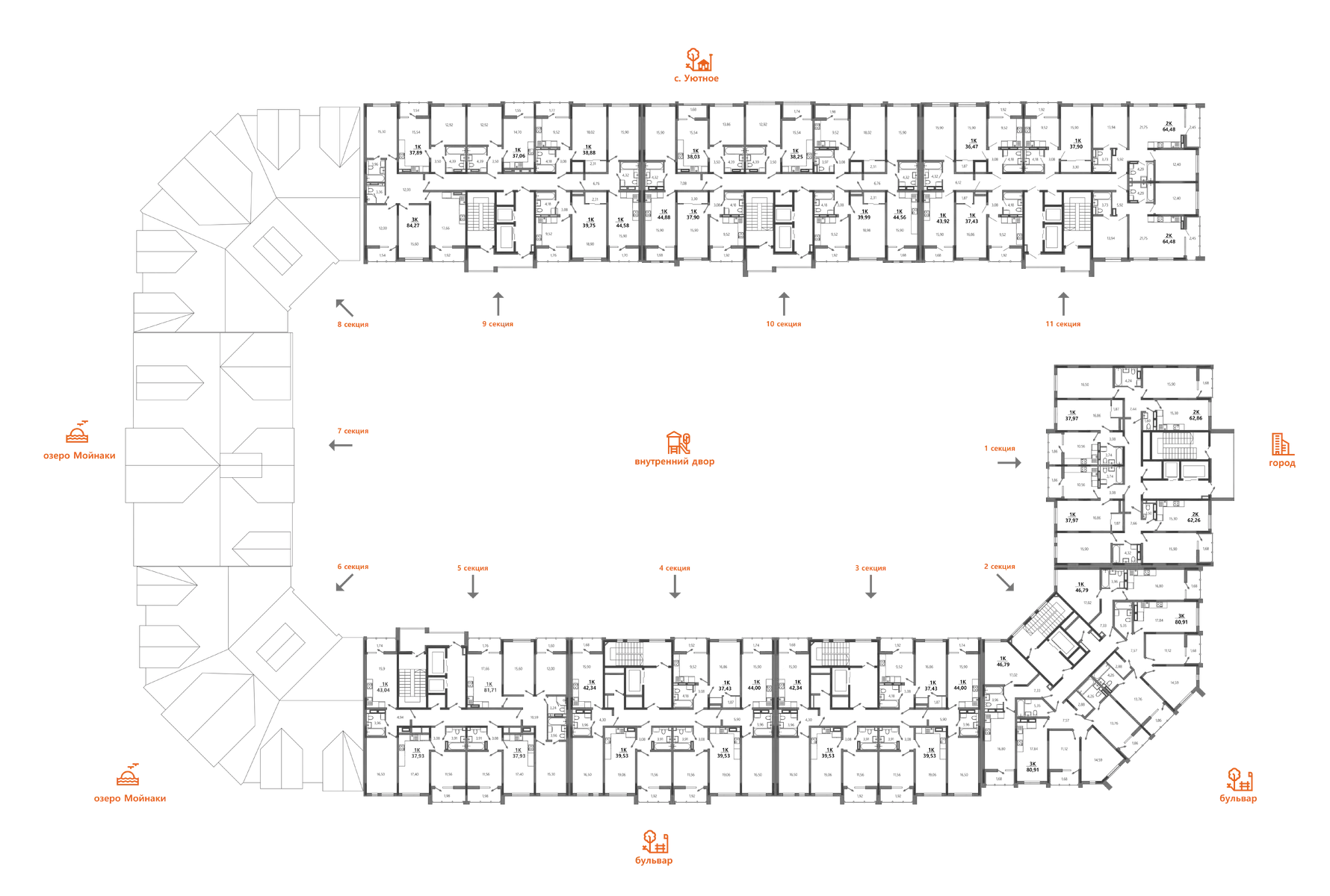 Квартиры с панорамным остеклением и мансардными этажами. Более 50 планировочных решений. Приватные жилые кварталы с собственной грязелечебницей и термами.