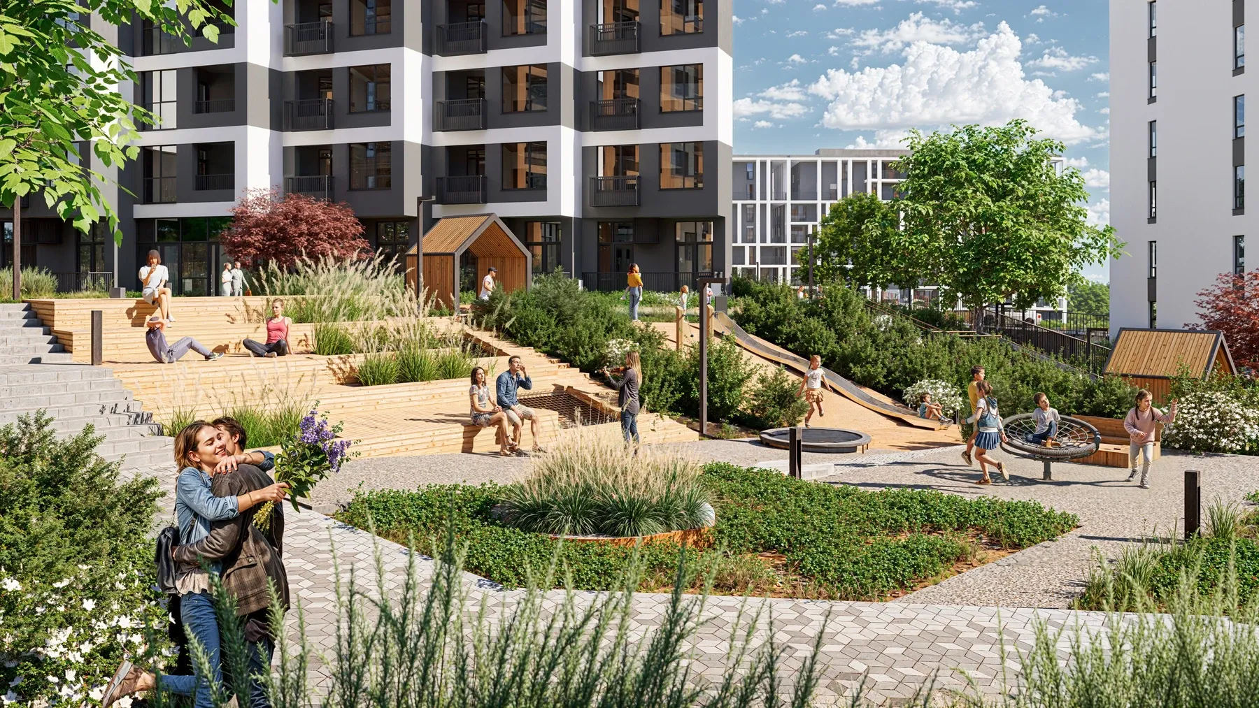 - Двор без машин — вся стоянка и многоуровневый паркинг вынесены за периметр.