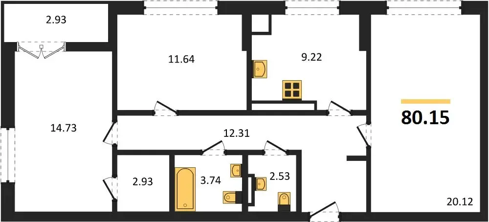 - Просторные трехкомнатные 80 м² — пространство для большой семьи