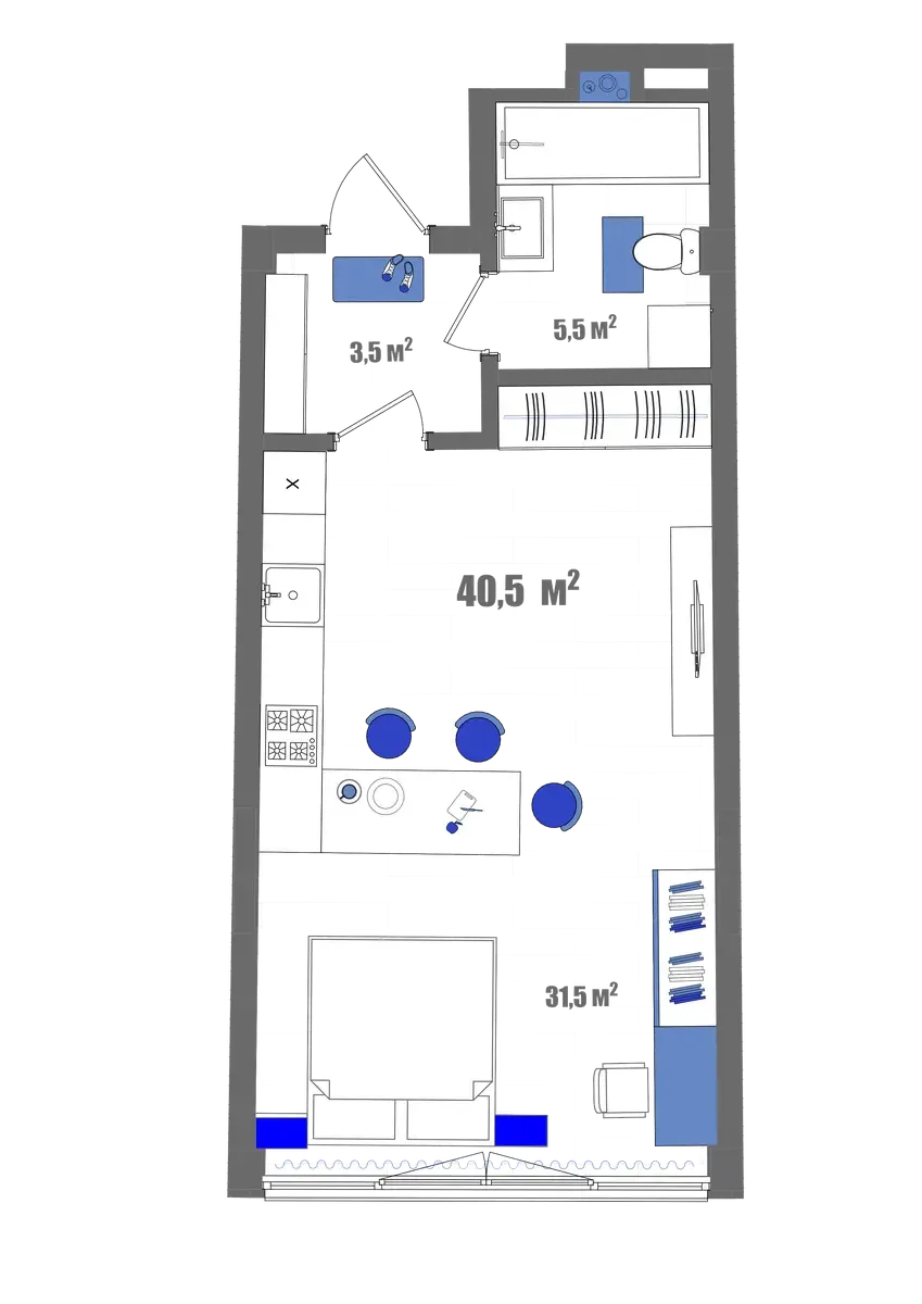 - Студия с видом на море (44.2 м²) — для романтиков и ценителей бескрайних просторов.