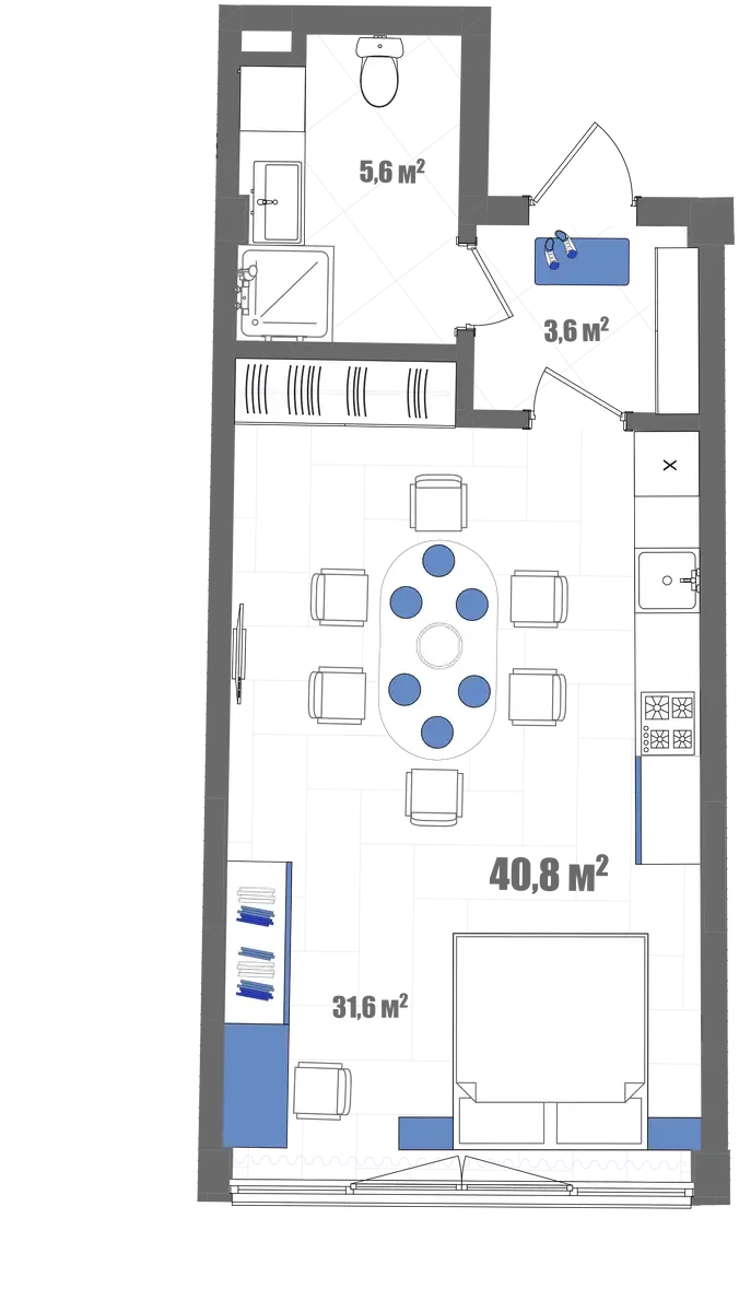 - Студия с видом на море (44.2 м²) — для романтиков и ценителей бескрайних просторов.