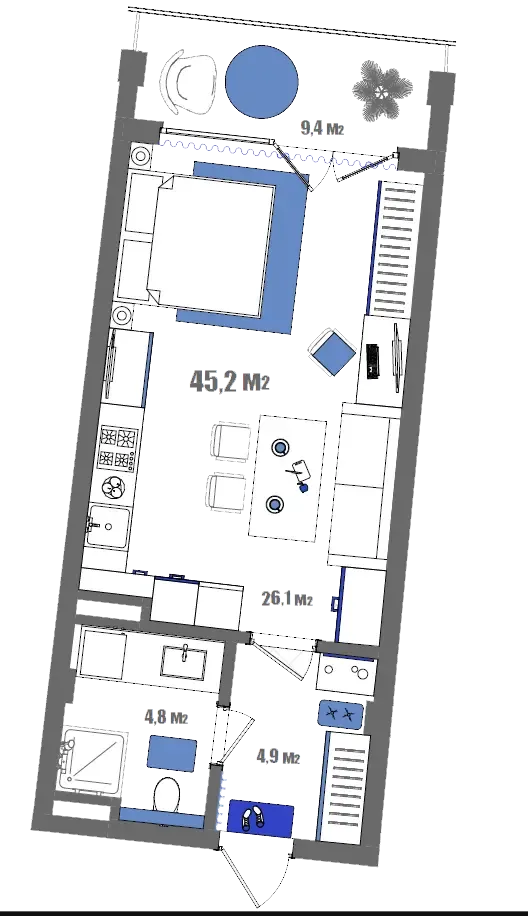 - Студия с видом на море (44.2 м²) — для романтиков и ценителей бескрайних просторов.