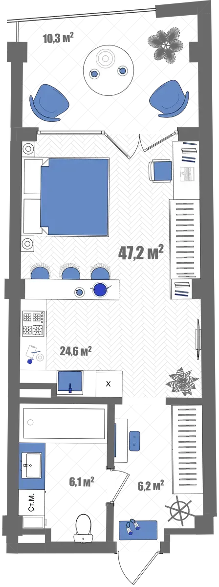 - Студия с видом на море (44.2 м²) — для романтиков и ценителей бескрайних просторов.
