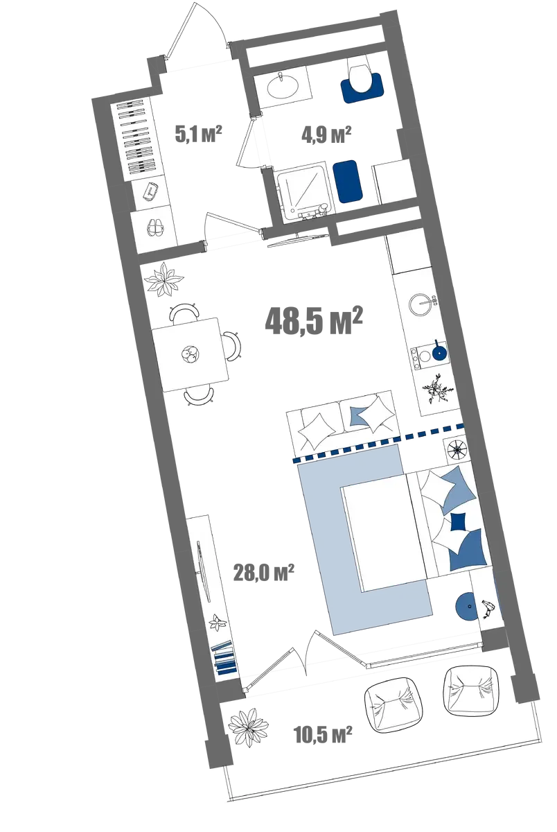 - Студия с видом на море (44.2 м²) — для романтиков и ценителей бескрайних просторов.