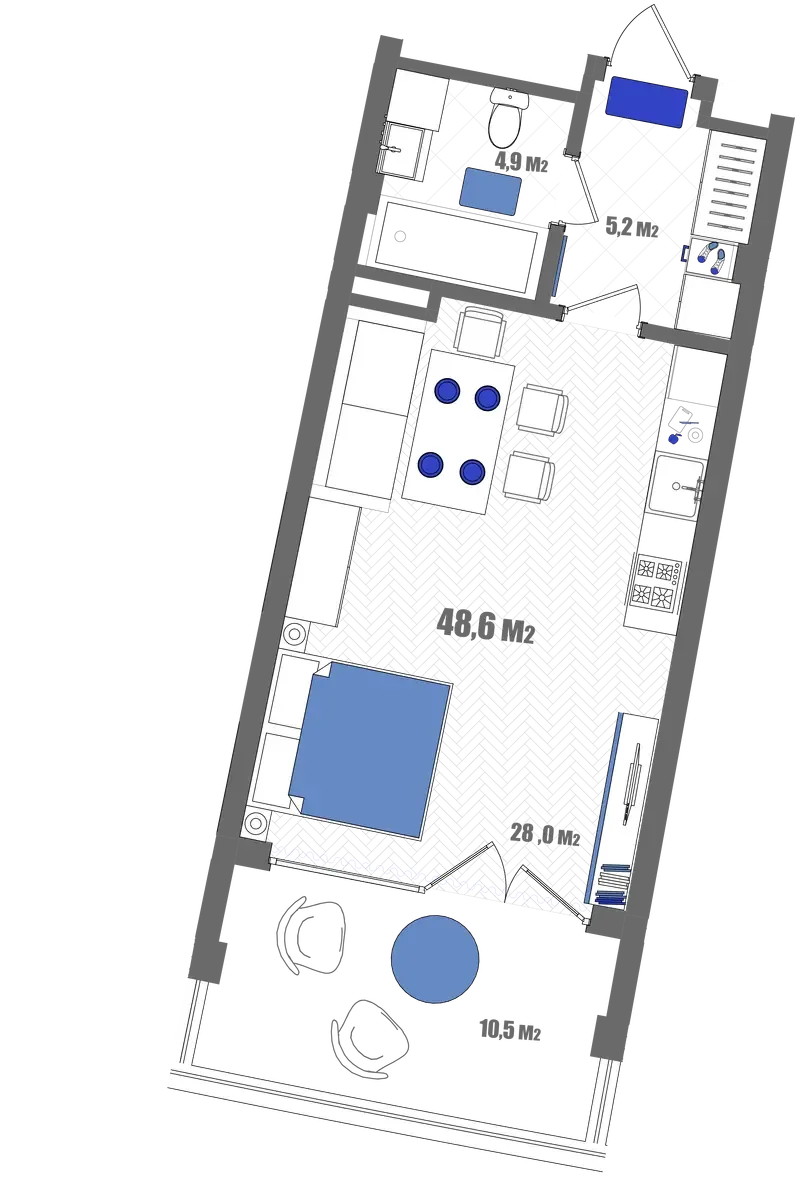 - Студия с видом на море (44.2 м²) — для романтиков и ценителей бескрайних просторов.