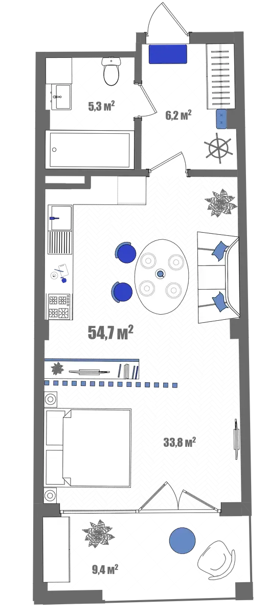 - Студия с видом на море (44.2 м²) — для романтиков и ценителей бескрайних просторов.
