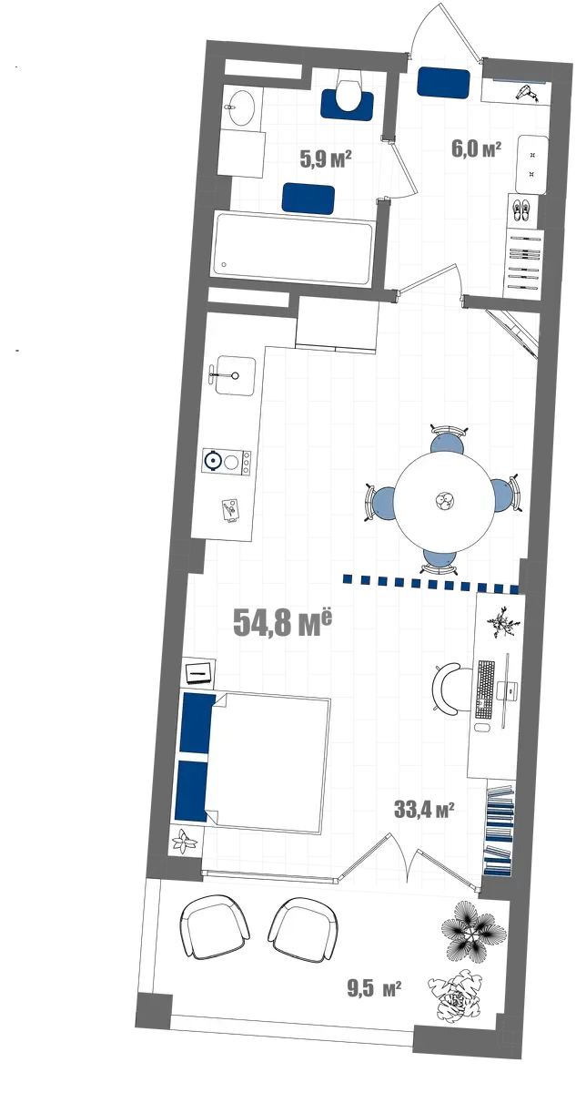 - Студия с видом на море (44.2 м²) — для романтиков и ценителей бескрайних просторов.