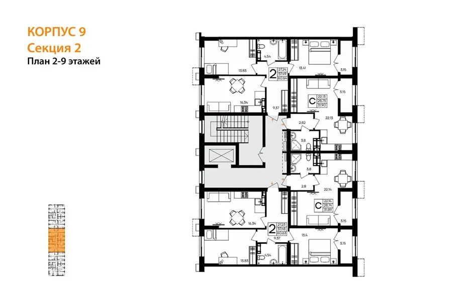 - 3 жилых квартала в 1 этапе строительства — 9 домов переменной этажности