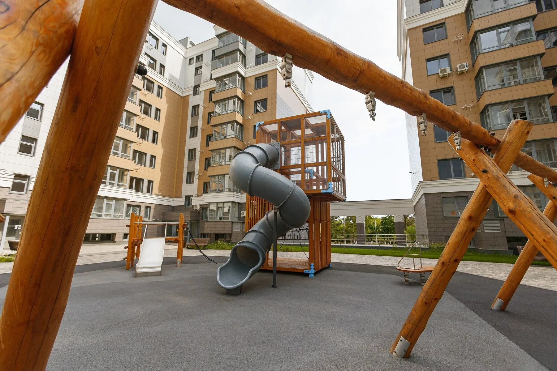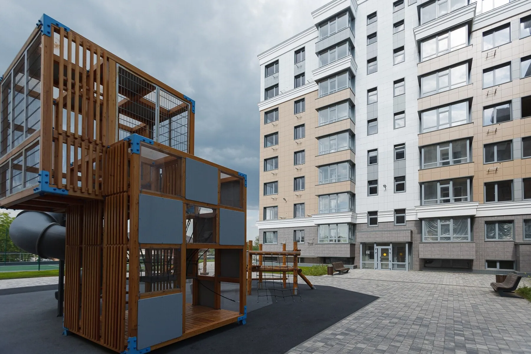 - Концепция «двор без машин» — главное преимущество комплекса. Автомобили остаются на безопасном подземном паркинге, попасть в который можно прямо из вестибюля. А двор становится зеленой, тихой зоной для прогулок, игр детей и спокойного отдыха. Среди предложений квартиры в Евпатории купить с собственным парковочным пространством — это большая редкость и преимущество.