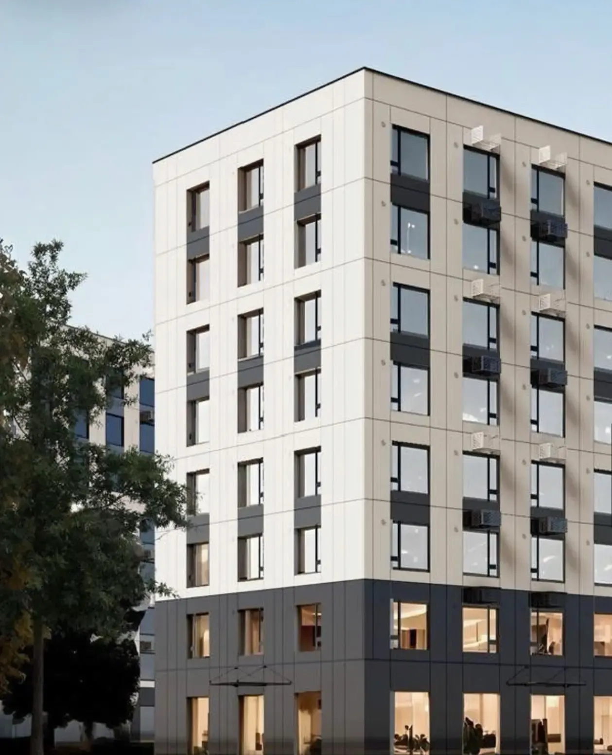 Три корпуса (7–9 этажей) выполнены в минималистичном стиле. Белые фасады с серыми акцентами, стальные панели, элегантный дизайн — всё это создаёт премиальный облик комплекса. Фасады из стальных панелей не только красивы, но и умны: отражение солнца предотвращает перегрев летом.