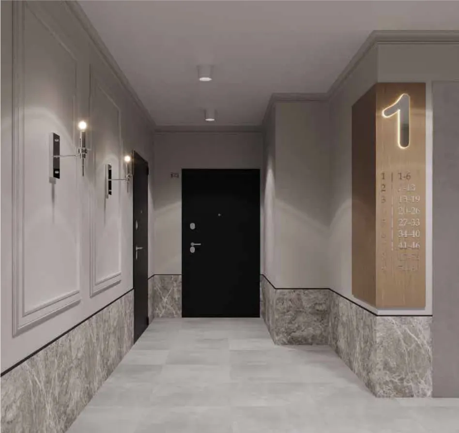 Интерьеры входных групп выдержаны в единой архитектурной концепции с фасадом: спокойные цвета, аккуратные линии, практичные и износостойкие материалы. Здесь вы чувствуете себя желанным гостем с первого шага.