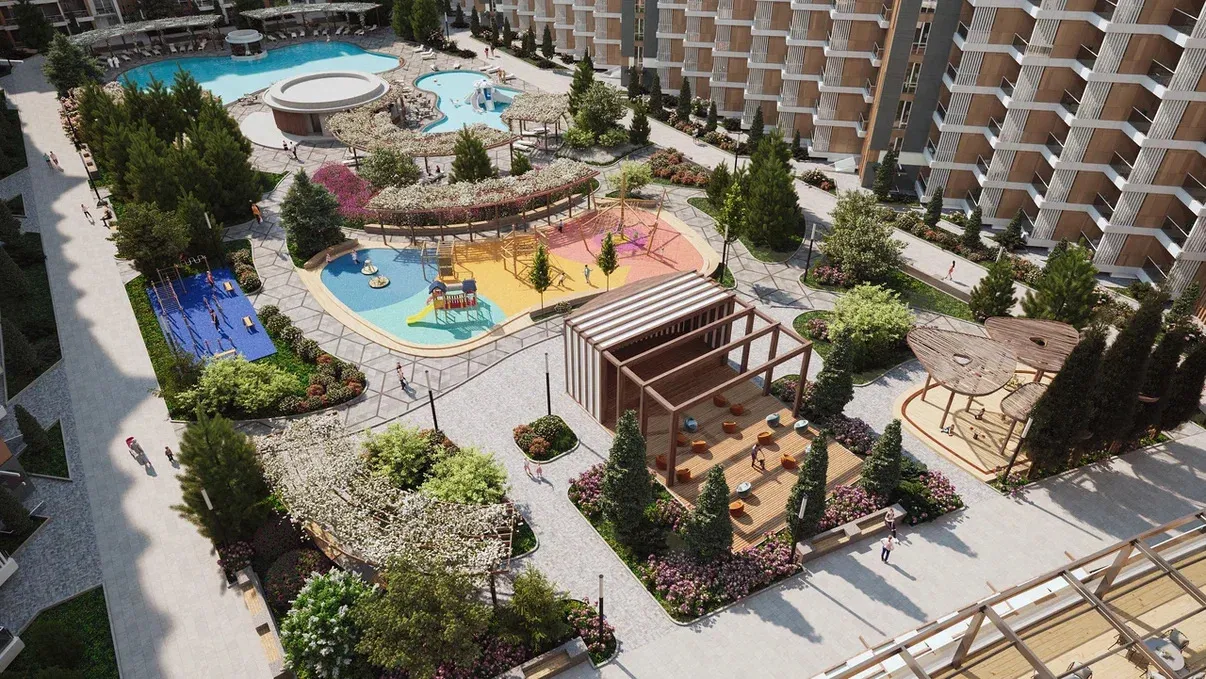 - Акватория на территории: Подогреваемые бассейны для взрослых и детей с горками, пул-бары.