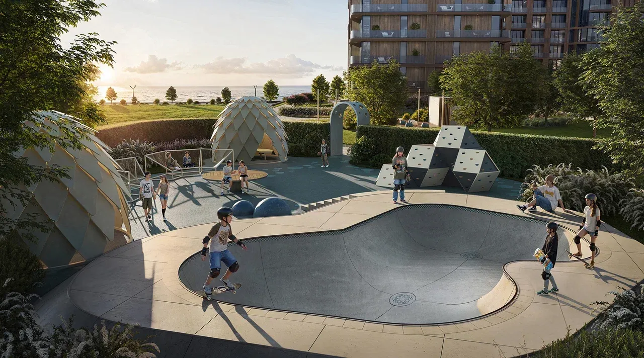 - Детский мир с игровыми площадками для различного возраста, скейт-площадка