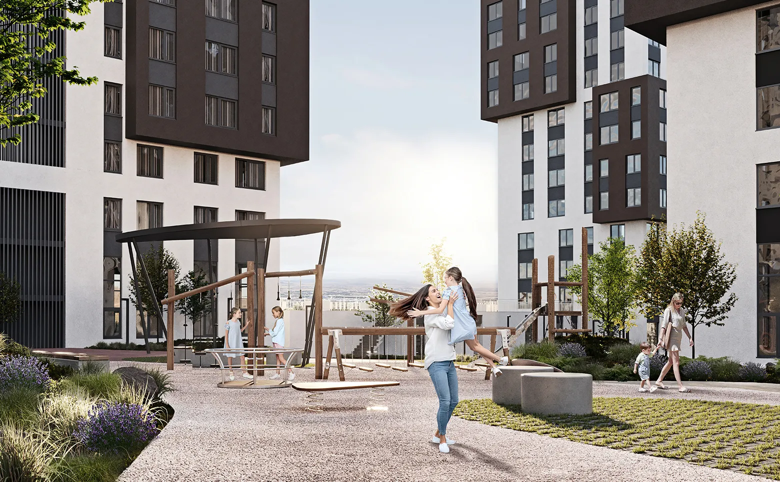 - Семьи с детьми — безопасный, развивающий двор с крутыми площадками (скалодром!). Если вам нужно купить однокомнатную квартиру в Симферополе для старта семейной жизни или выбрать вариант побольше — здесь есть 38 вариантов на выбор.